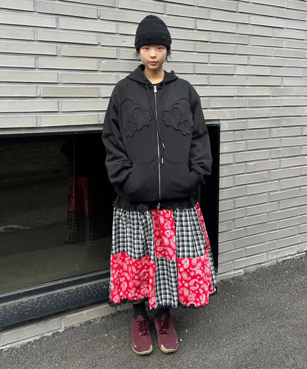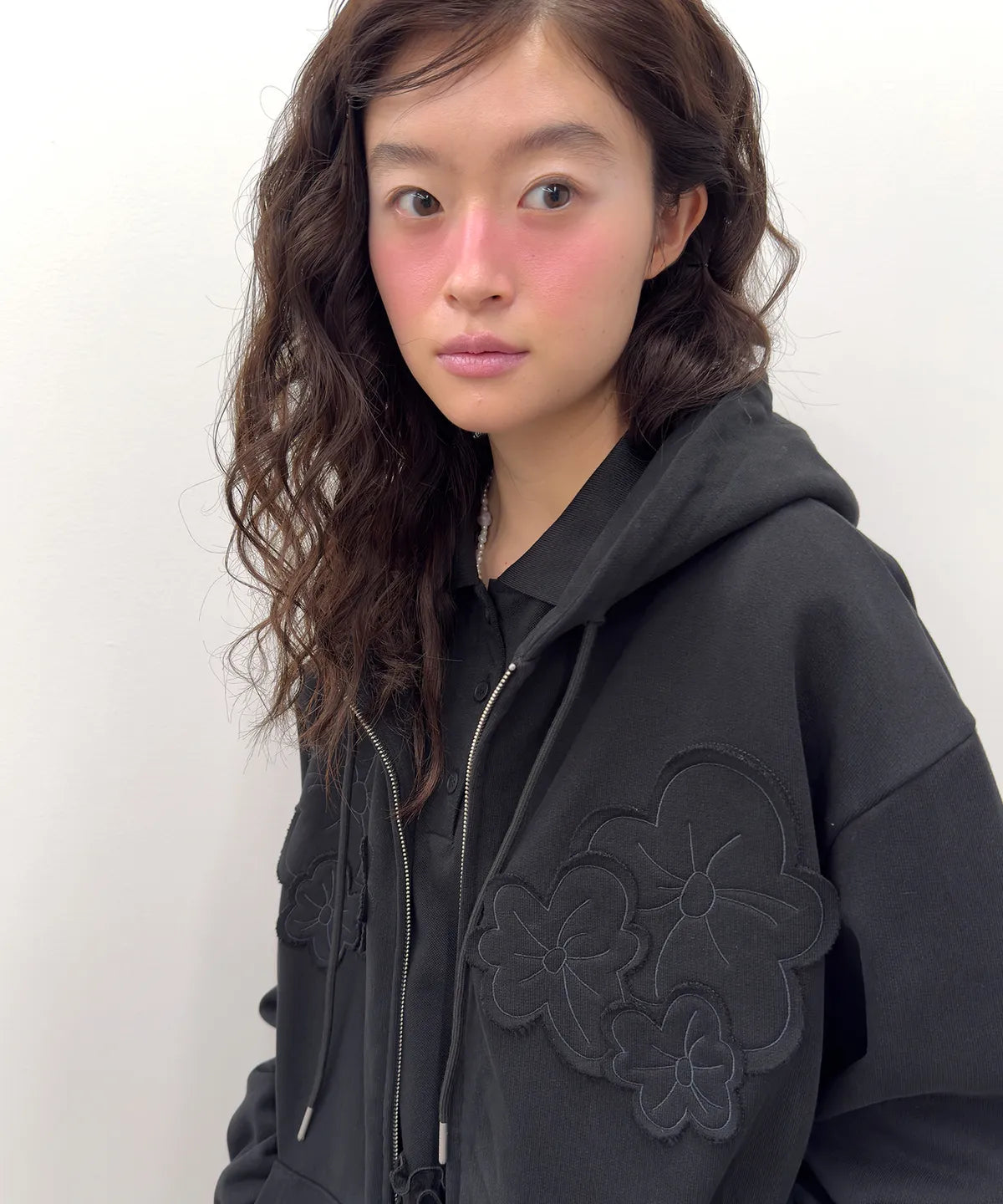 Flower Appliqué Zip Hoodie [Black]