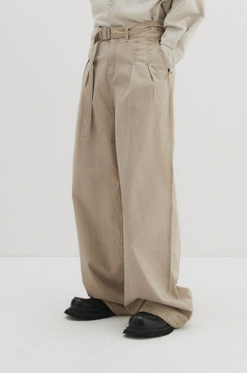 Belted Herringbone Pants (Beige)